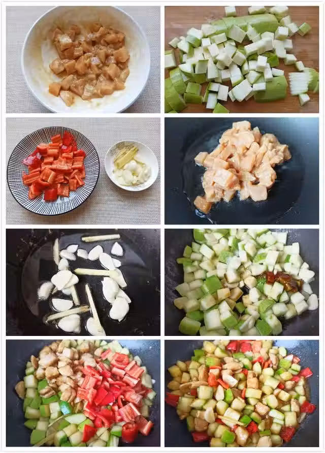 7、等西葫蘆熟的差不多,下入炒好的雞胸肉,青紅椒,一起翻炒均勻,紅椒斷生,即可出鍋。