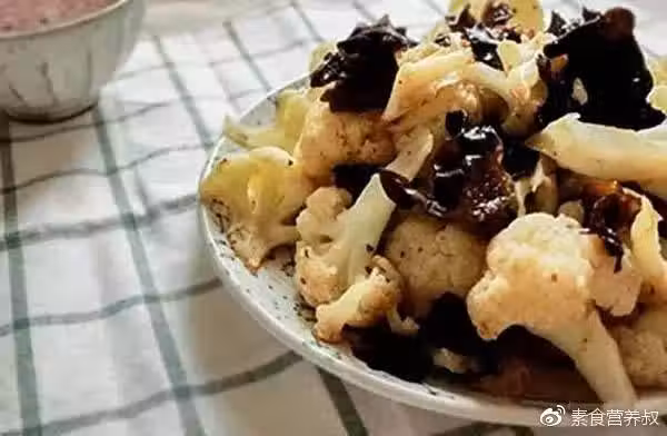 1、木耳提前泡發兩小時洗凈,花菜洗凈汆水,備用。