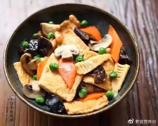 材料:老豆腐一塊,竹筍一根,胡蘿蔔半根,青豆一小把,口蘑兩三個,香菇兩朵,花生、木耳少許,姜兩片,鹽1/2小匙,生抽2小匙,冰糖2塊,白鬍椒粉少許