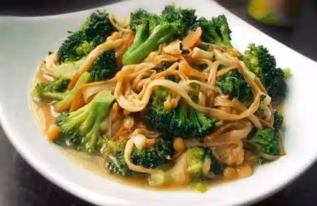 食材:西蘭花1棵,金針菇1把,生薑,素蠔油,醬油,澱粉,芝麻油,香油適量。