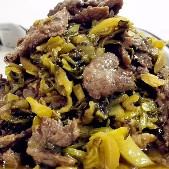 牛肉300g;酸菜200g;鹽、雞精適量;姜蒜適量;花生油適量
