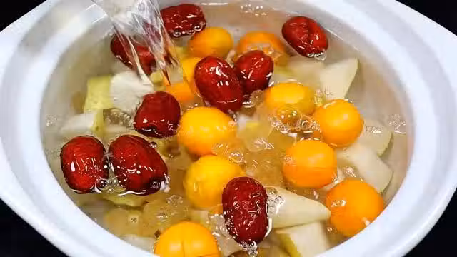 3.準備一個砂鍋,將雪梨、金桔、紅棗全部倒入砂鍋內,再加入適量的黃冰糖,倒入適量的清水沒過食材,蓋上蓋子,大火煮開後,轉小火煮20分鐘。