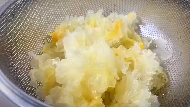 2.銀耳泡發好後,用剪刀剪去根部,用手撕成小塊,再用清水淘洗乾淨,洗凈後放入肉囊中瀝干水分,蓮子浸泡好後,去掉蓮子的心,再用清水洗凈備用。