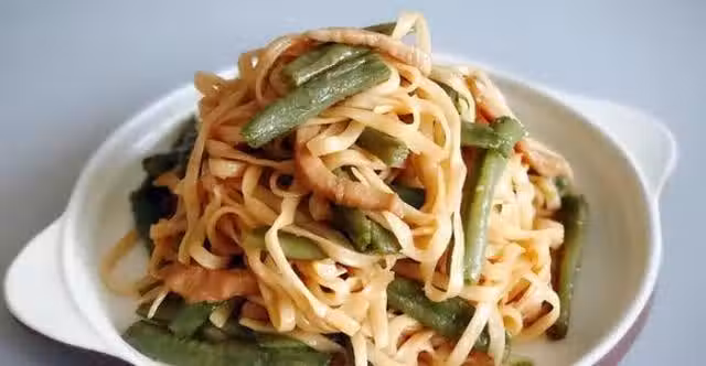 豆角1斤;豬肉3兩;鮮手工面1斤;蚝油1勺;老抽適量;生抽適量;八角2顆;油適量;鹽適量;白糖適量;蒜蓉適量;香油幾滴(出鍋用)