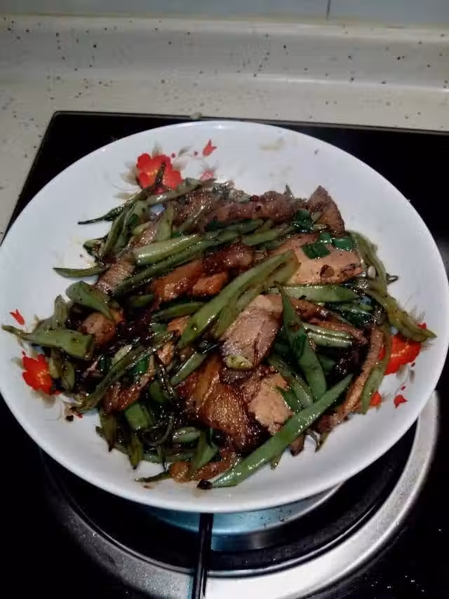 用料:豆角適量、豬肉適量、鹽適量、老抽、生抽、蔥花、姜
