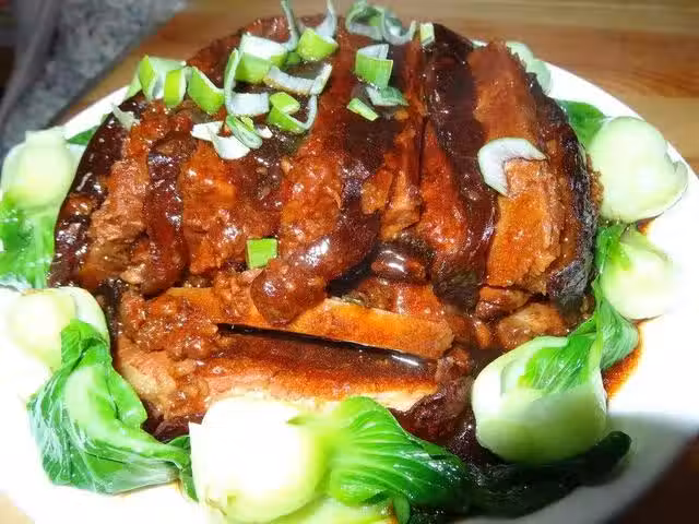 10.在盤內裝飾燙熟的江青菜,將碗內蒸出的湯汁倒入鍋內加熱至濃稠,淋在扣肉表面即可