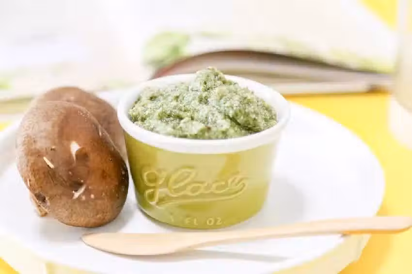 6. 將蒸煮好的香菇和油菜攪拌成泥