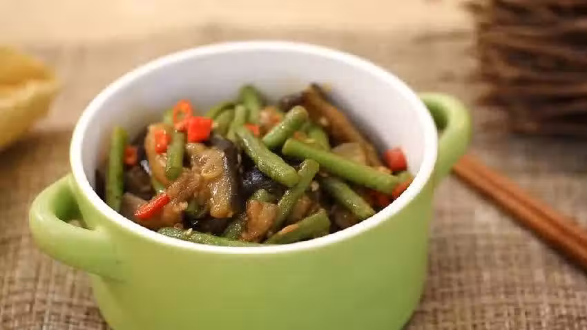 長豆角200克,茄子1個,紅米椒50克,薑末適量,生抽1勺,素蠔油1勺,鹽1茶匙