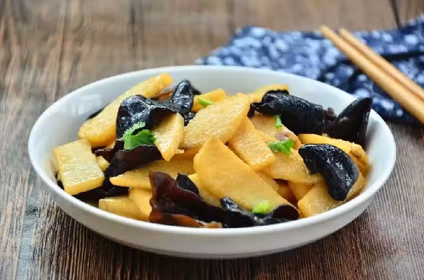 4、木耳炒熟後將山藥撈出加入,翻炒均勻