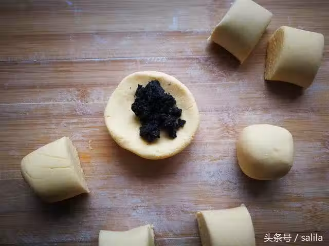 5、依次包好每一個劑子,用手掌將包好的劑子一個個輕輕按扁。如果您和的麵糰比較柔軟,怕粘的到處都是,可以在案板上鋪上一層保鮮膜或保鮮袋。
