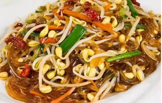 鍋內倒入油加熱,先放辣椒干、姜、蒜煸炒出香,再放入蔥、豆芽炒,放入鹽、糖、生抽炒一分鐘,放入冷卻後粉絲(倒入前用筷子攪動下粉絲)噴水炒,炒5分鐘左右,放入胡蘿蔔絲、雞精翻炒一下,出鍋裝盤。