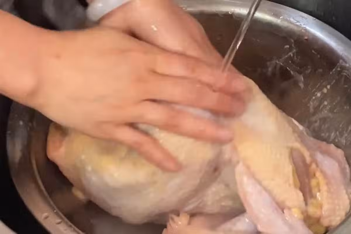 3、用流動的清水再次沖洗整隻雞,主要把雞身上的麵粉疙瘩沖洗掉。
