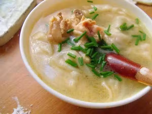 雞蛋蛋清一個;雞湯;麵粉200g;鹽;豬肉;薑汁水;白鬍椒;生抽