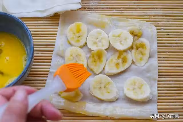 4、蓋上一張春卷皮,再鋪一層香蕉片,撒上糖和鹽的混合物,只要一點點就可以,不能放太多,四周留邊並刷蛋液,最後蓋上一張春卷皮,三張麵皮兩層香蕉,輕壓四周,給餅子封口。