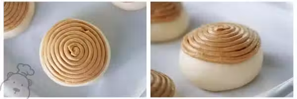 8、 將擠好酥皮的麵糰放入烤箱中180度烘烤18分鐘即可,烤的時候酥皮會慢慢流下來覆蓋整個麵包,治癒!