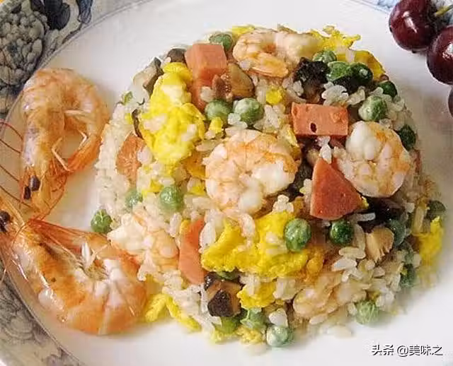 米飯1碗、雞蛋2個、火腿腸70克、豌豆60克、香菇8朵、鮮蝦150克、蔥適量、姜適量、鹽適量、糖適量、料酒適量、雞精適量、胡椒粉適量。