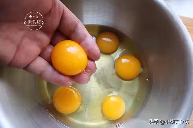 第二步:把分離出來的蛋黃放在另一個碗里,加入40克玉米油,再加入60毫升純牛奶。