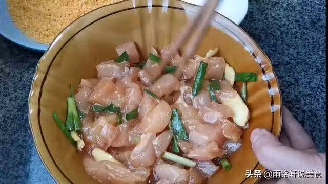 第五步:雞胸肉腌制好再把它攪拌均勻,把蔥段、薑片撿出來不要。