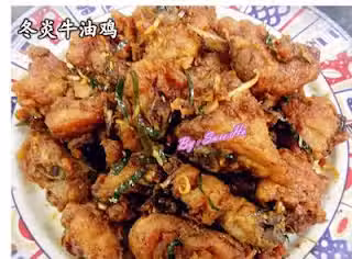 材料A:雞腿(切塊)3隻,牛油2大匙 材料B:香茅(切碎)3支,辣椒仔(切碎)1小匙,風柑葉(切絲)1小匙,冬炎醬1大匙,清水150毫升 醃料:鹽1小匙,雞蛋1粒,粟粉1大匙半,麵粉1大匙半 做法:1.將雞肉加入醃料拌勻,醃製2小時左右。2.鍋裏熱油,放入雞肉炸至金黃色,盛起,瀝幹油備用。3.熱鍋,加入2大匙牛油煮溶,加入B料炒香(除了清水),加入雞肉拌炒,加入清水煮至水幹即可。