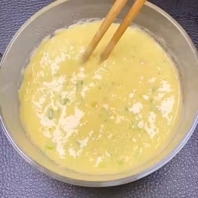 第三步:雞蛋糊攪拌好了,接下來就到了煎制的過程了。鍋中倒入少量的食用油,待鍋熱後,轉入小火。往鍋內倒入雞蛋糊,攤平等到雞蛋餅成形後,來回翻面保證雞蛋餅兩面都能夠受熱。