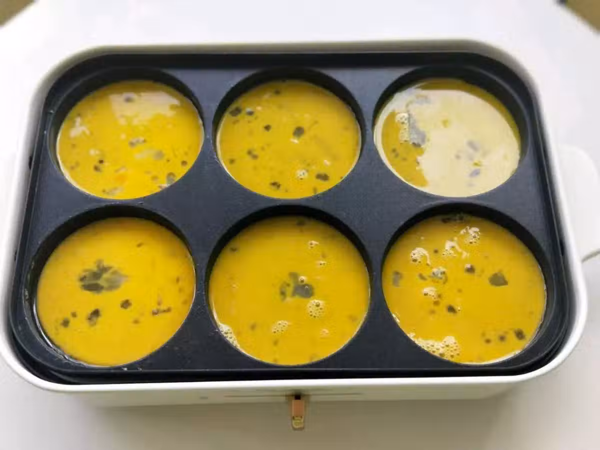5、然後再將雞蛋液全都倒進圓盤裡面,每一個圓盤裡面不用太多,剛剛蓋住底部即可,不然蛋餃做出來的太厚該不好看了。