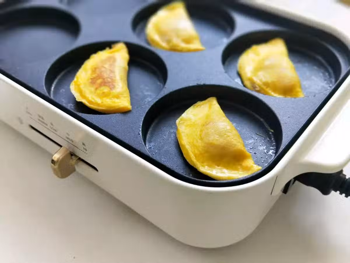3、如果沒有這個鍋,可以用平底鍋做,或者用傳統的方法用鐵湯勺做,方法都一樣,先加熱再刷油,然後倒蛋液攤成圓形。