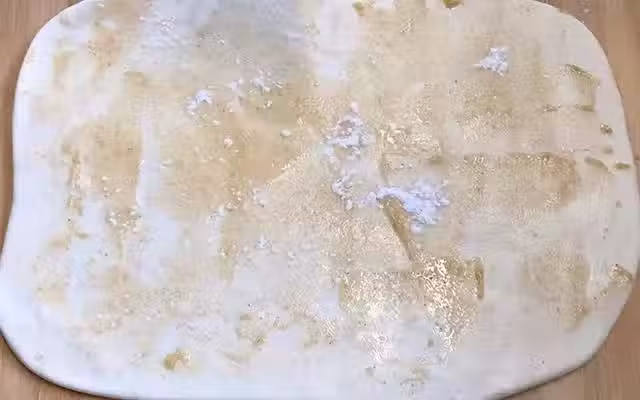 第四步:把疊好的餅再次擀開,然後換個方向繼續擀成長方形,再用同樣的方法抹上油酥、撒上乾粉,再次疊好;最後把餅擀成厚度是0.8-1厘米的薄片。
