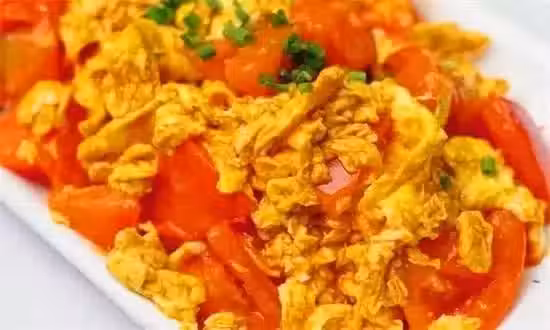 食材:番茄5個、雞蛋4個;輔料:食用油適量、蔥1根、食用鹽少許、雞精適量