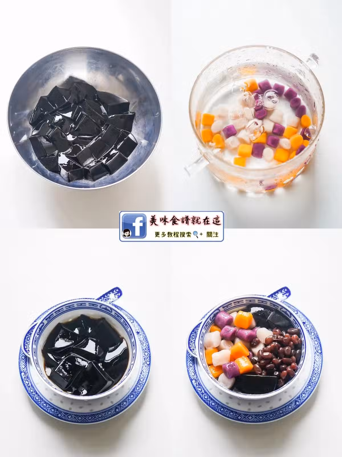 糖水碗里先鋪上切好的黑涼粉,加入芋圓和蜜紅豆,再淋上適量的牛奶就好了。