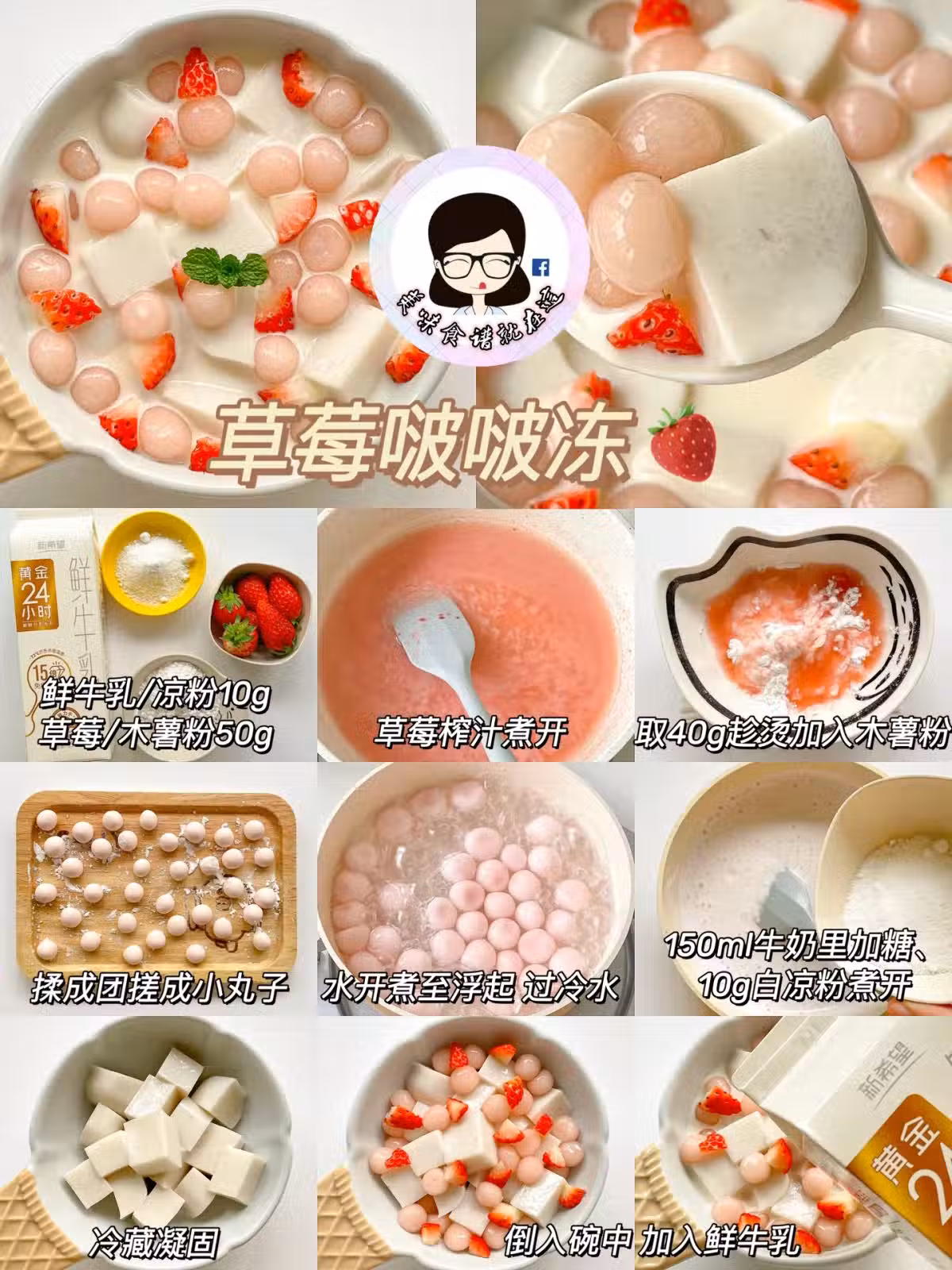 鮮牛乳、草莓、白涼粉10g、木薯粉50g