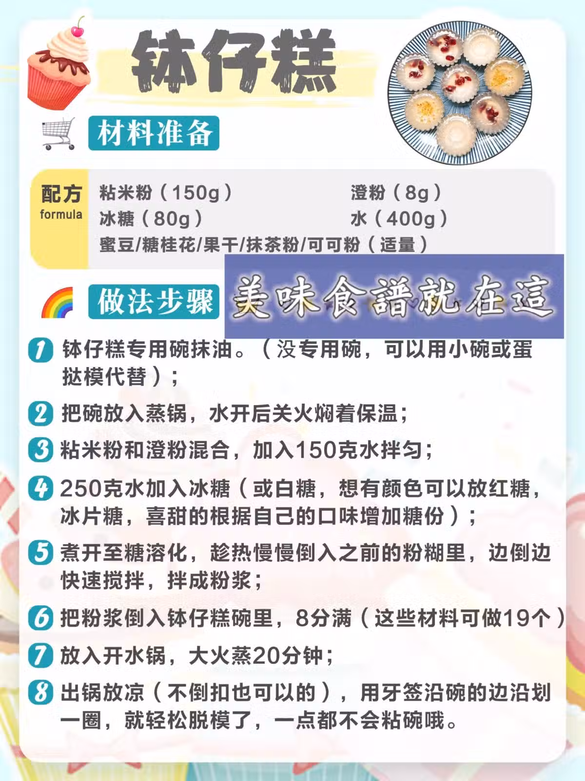 配方:粘米粉150g、澄粉8g、冰糖80g、水400g