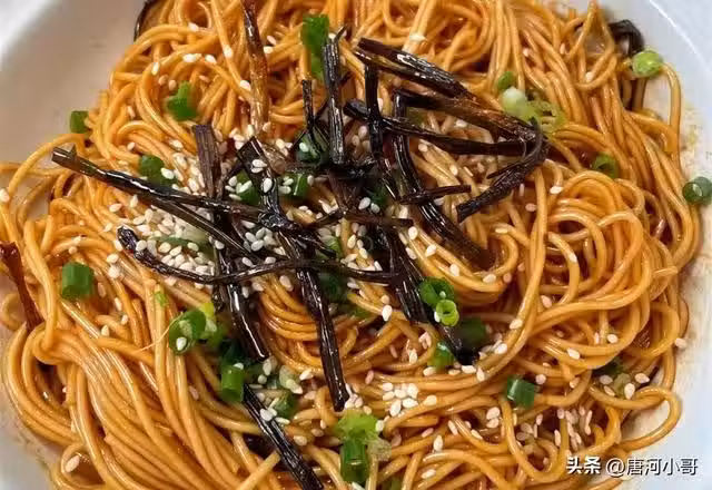 4、麵條煮好後撈出,把蔥油醬淋在麵條上,撒上白芝麻、小蔥,最後把炸酥脆的蔥葉拌勻就可以吃啦。