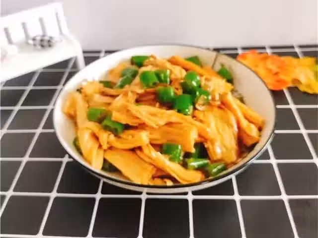 青線椒3根、腐竹5根、清水、食用油適量、生抽一勺、老抽一勺、鹽一勺
