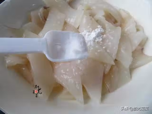 2、將魷魚沖洗一遍,改切成刀花放入盆中,加入1勺澱粉和一點食鹽,反覆抓洗幾遍,去掉魷魚的粘液與腥味。