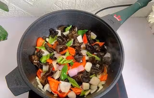 6.鍋中再放少許油,放大蒜蔥白爆香,放青紅椒,洋蔥,木耳翻炒。