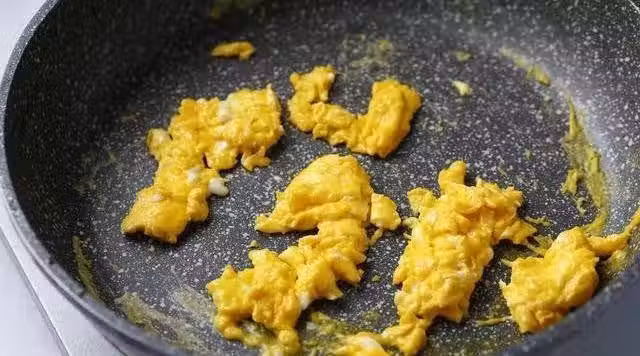 7.加入絲瓜絲塊,稍微攪拌,加入適量的水,在水中煮沸,加入煎蛋,攪拌均勻,煮一兩分鐘。