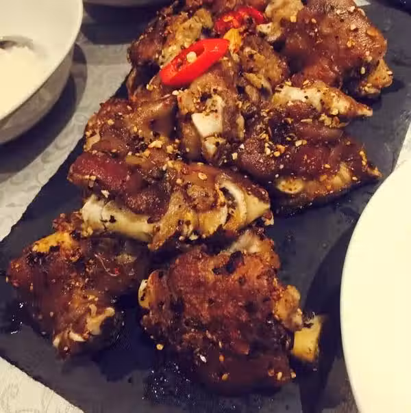 7.鍋里留少量油,煸炒蔥蒜片(干辣椒),放入豬蹄,再撒上椒鹽、孜然,翻炒均勻即可