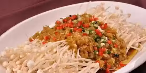 材料:金針菇400克、朝天椒適量、姜2片、蚝油1茶匙、醋2茶匙醬油1/2茶匙、辣椒油2茶匙、香油1茶匙、食鹽1/2茶匙、蒜3瓣、蔥1段、雞粉少許。