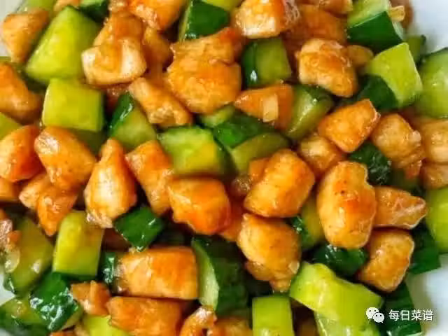 2、起鍋燒油,油熱後放入腌制過的雞胸肉煎一下,煎至表面焦黃即可控油撈起。鍋中底油爆香蒜末,再放入雞胸肉和黃瓜丁翻炒均勻。