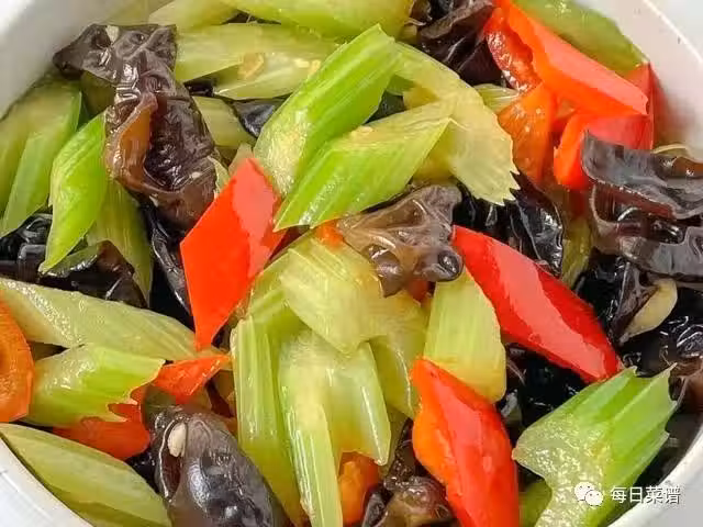 準備食材:芹菜,木耳,紅椒,蒜末。