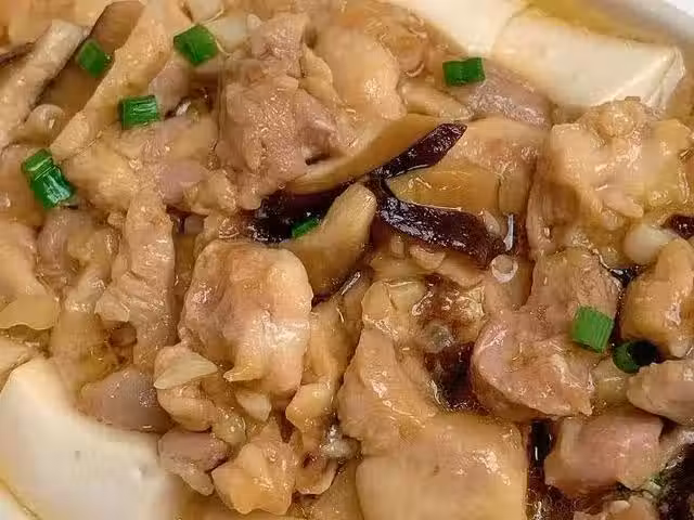 準備食材:嫩豆腐,雞腿肉,香菇,薑絲,蒜末。
