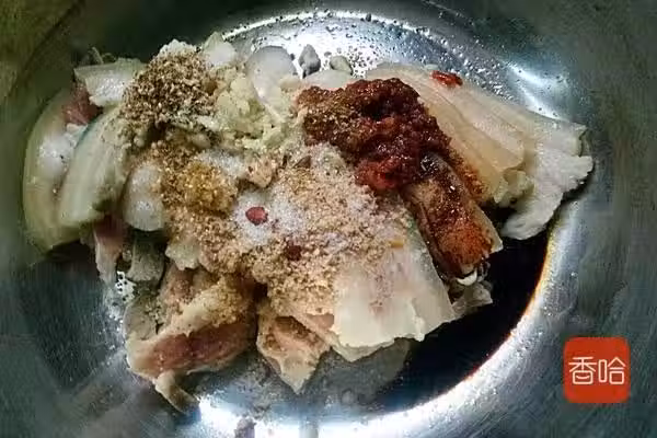 8.用一個蒸碗,把拌好的肉片依次放入碗里,注意肉皮要朝碗底,