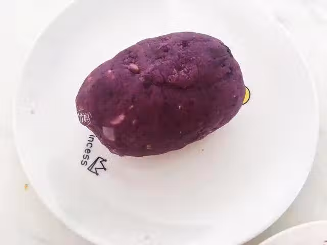 5、一片手抓餅,一片芝士疊在一起,放上揉好的紫薯泥。對角折起來,封口 ,用叉子壓一下邊。