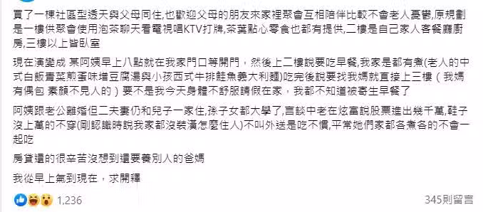 阿姨的行為讓原PO傻眼,並說明這位阿姨與老公已經失婚了,不過夫妻仍和兒子住在一起,目前孫子、孫女都上大學了,平常聊天都在炫富,說是股票進出幾千萬、鞋子沒上萬的不穿,還會嫌棄原PO家都沒裝潢,會來他們家吃早餐,是因為阿姨家都各煮各的,也不想叫外送因為吃不慣...