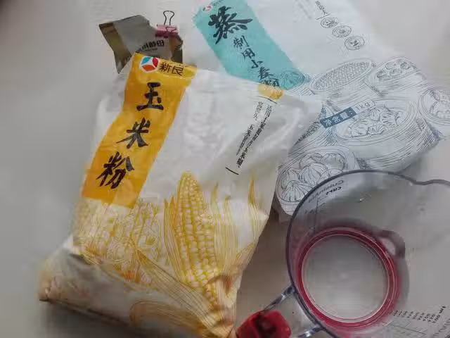 2、將玉米粉先用燒開的熱水用筷子將其攪拌成絮狀,如圖所示。