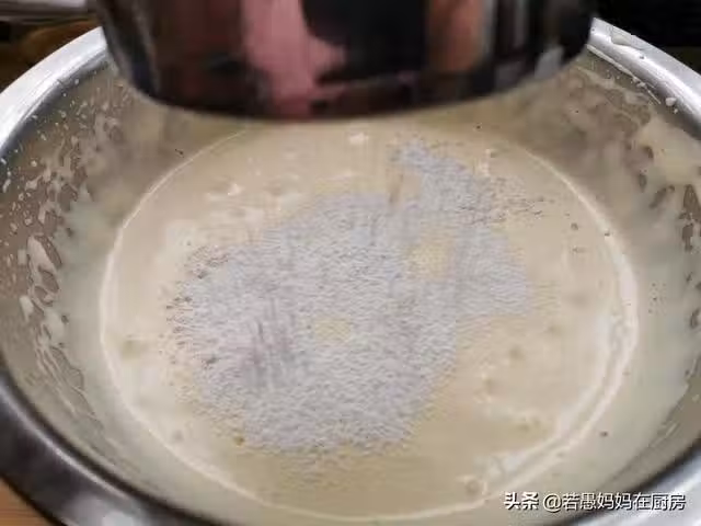 4、拌麵糊的時候不要轉圈攪拌,像炒菜一樣翻拌均勻。拌好的麵糊是蓬鬆的狀態。