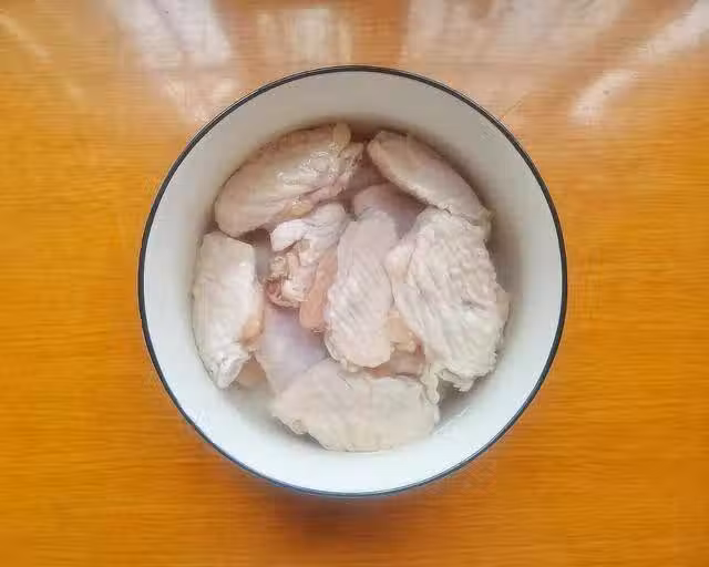 2、10分鐘後,將雞翅中撈出,擦乾表面水分,放在盆子內,此時,我們往手裡倒入少許料酒,均勻的抹在每一個雞翅中上