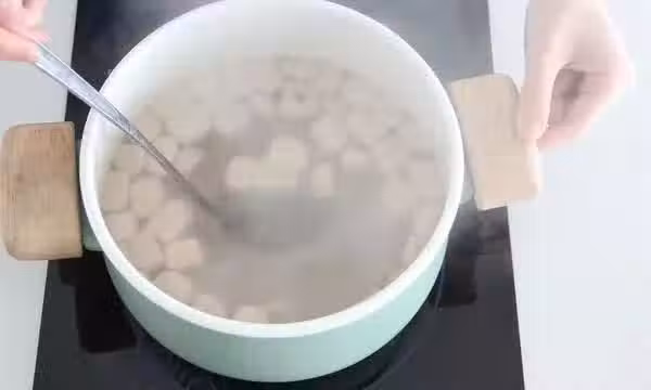 步驟11撈出芋圓,放入涼白開中浸泡,晾涼。(放入涼白開中防止芋圓粘在一起,也可使口感更加緊實Q彈。)