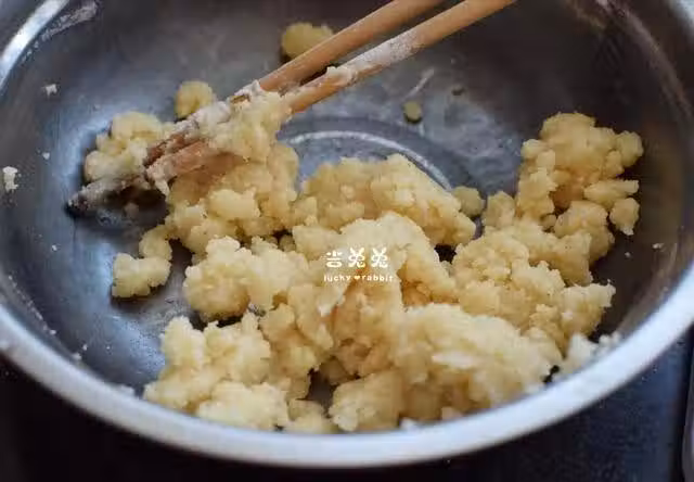 4、酵母水倒入普通麵粉中,用筷子攪成絮狀。