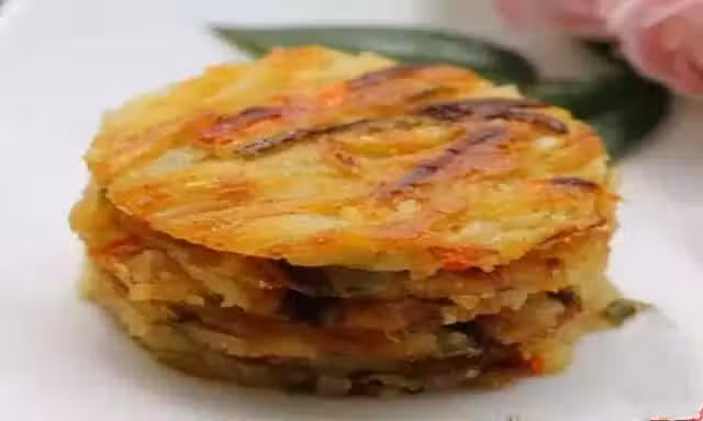 3.邊煎邊用鏟子按壓土豆絲,使土豆絲成餅;